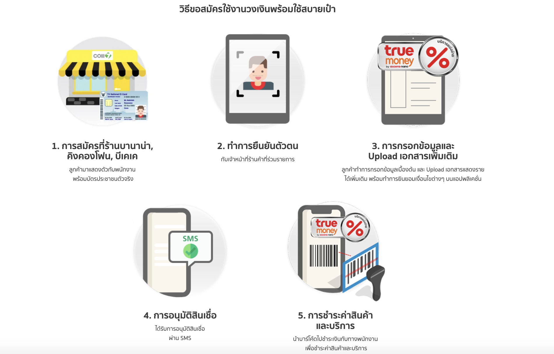 | คุณสมบัติผู้สมัคร 1. สัญชาติไทย 2. อายุระหว่าง 20 60 ปี 3. ผู้สมัครต้องมีรายได้ 8,000 บาทต่อเดือนขึ้นไป 4.มีบัญชี ทรูมันนี่ วอลเล็ท ที่พร้อมใช้งาน 5.มีอีเมลที่สามารถติดต่อได้ |